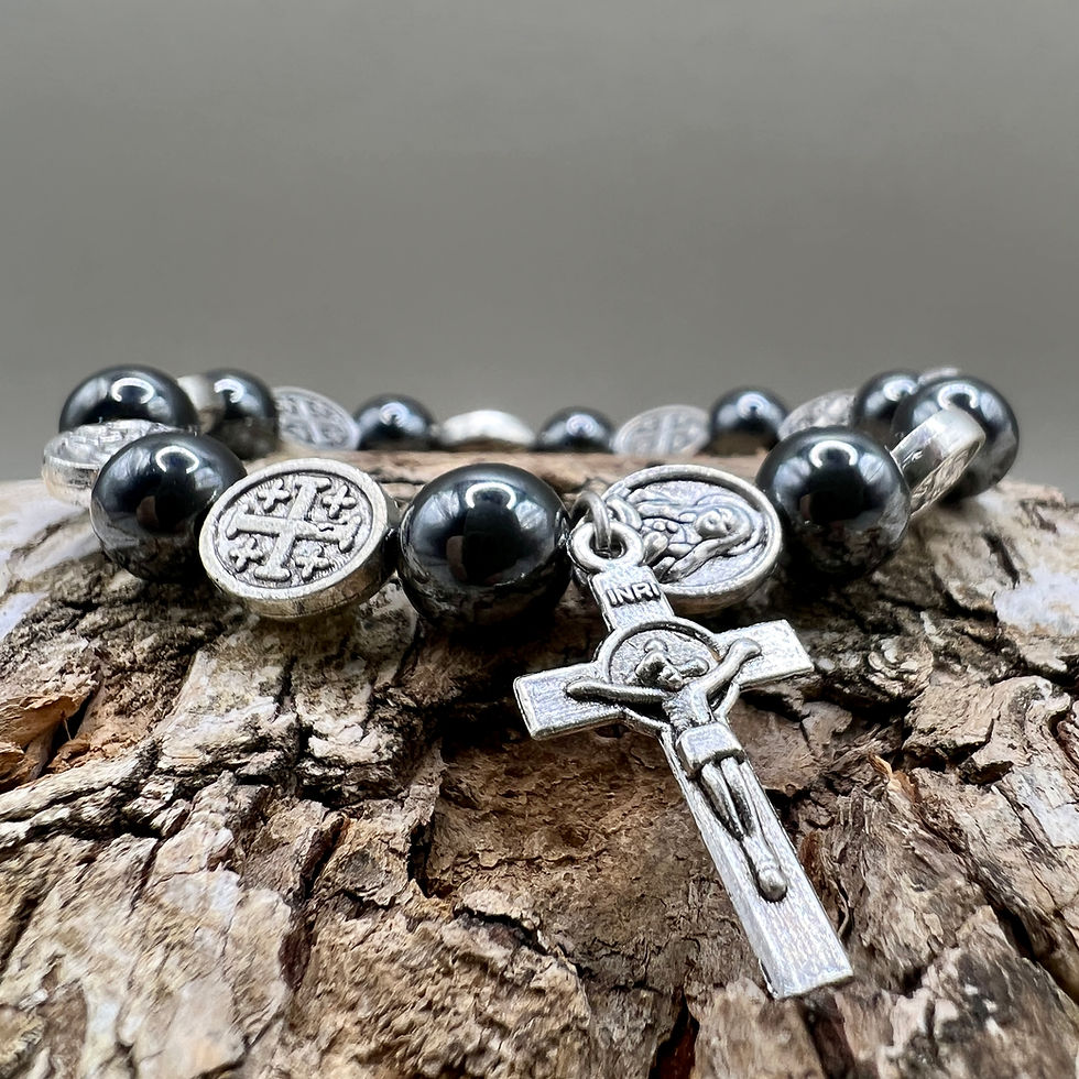 Handmade Natural Hematite Stone Catholic Rosary Bracelet